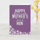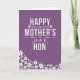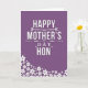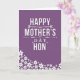 This greeting card features a deep violet background that sets a cozy, romantic tone, like a quiet evening note shared with someone you cherish ❤️. Centered vertically, the main message reads “HAPPY MOTHER’S DAY HON” in large white sans-serif letters, standing out clearly against the dark field. Thin decorative flourishes with tiny heart shapes and leafy curls sit near the wording, lightly framing it without crowding the space. A faint shadow behind the white letters gives the text a gentle lift, as if it’s floating just above the surface. The layout feels affectionate and close, with the centered phrase resembling a direct, tender line spoken face to face. In the lower-left corner, small white blossoms gather and trail upward, adding a soft, friendly touch 🌼. The flowers are five-petaled, varied in size, and each has a subtle shadow that makes the cluster look lightly layered against the violet background.
