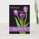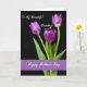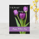 Designed with a tall layout, the card shows three purple tulips rising from deep black, like a small bouquet offered with quiet affection ❤️. One central tulip is crisp and detailed, its dark violet petals catching soft highlights, while the two side blooms fade slightly out of focus as if leaning in close. The green stems and wide leaves add a fresh contrast, curving upward and gently framing the flowers like an embrace. Near the top, white flowing lettering arcs across the dark space reading “To My Beautiful Grandma,” giving the design a tender, devoted tone. Along the bottom, a wide purple band stretches across the card, echoing the tulip color and grounding the composition. Centered on that band, “Happy Mother’s Day” appears in matching white lettering, clear against the rich purple 🌼. The background stays fully black, making the blooms and the purple banner stand out with strong contrast and a soft glow.