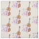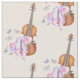 Patterned fabric with a soft feminine design. Illustrated with a watercolor image of a wooden violin, some pink ballet slippers resting against it and decorated with flowers and butterflies. Set on a peach pink colored background.