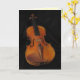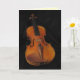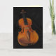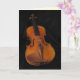 This note card presents a classical still life of an elegant old violin. This graceful instrument is essentially a hollow wooden box with rounded ends, two graceful f holes and a narrow center. The four sets of strings extend from a string holder at the bottom of the body over a raised bridge to the end of the narrow neck, or fingerboard where the four strings are inserted into a pegbox and are held there with pegs. The pegs are used to tune the violin. When the bow is drawn across the strings on the body of the violin it produces incredible, magical music! The gorgeous golden brown, almost orange tones are set off by graceful black velvet fabric. A small violin is inside.