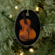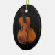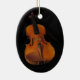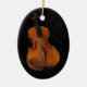 This holiday ornament presents a classical still life of an elegant old violin. This graceful instrument is essentially a hollow wooden box with rounded ends, two graceful f holes and a narrow center. The four sets of strings extend from a string holder at the bottom of the body over a raised bridge to the end of the narrow neck, or fingerboard where the four strings are inserted into a pegbox and are held there with pegs. The pegs are used to tune the violin. When the bow is drawn across the strings on the body of the violin it produces incredible, magical music! The gorgeous golden brown, almost orange tones are set off by graceful black velvet fabric.