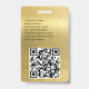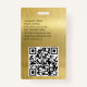 A minimalist modern design with elegant font for custom name and event information. Classic black font with your details on a chic brushed gold metallic look background. The name badge can be customized with your name, contact information and social media handles. The QR code can be customized to direct to your website.