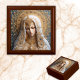 Elegant wooden keepsake box with glossy tile top featuring the Virgin Mother Mary in faux 3D-style art. She is depicted with a soft, gentle gaze against a pale blue background, adorned with a halo of golden rays, pearls, and ornate gold accents. A meaningful gift for baptisms, confirmations, Mother’s Day, or Marian devotion - perfect for rosaries or jewelry.