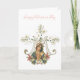 This is a lovely traditional Catholic image of the Blessed Virgin Mother Mary, with a floral bouquet below on a Marian Cross with white lilies. The same image with a holy rosary is on the inside left of the card. Text and fonts may be modified.