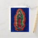 Nuestra Senora de Guadalupe, Our Lady of Guadalupe, Holy Mother, Virgin Mary, Patroness of the Americans, Empress of Latin America, Protectress of the Unborn, Queen of Mexico, Mexican Roman Catholic icon, religious figure. December Feast Days. Colored Pencil Drawing by Loni. Prismacolor Painting by Elaan Yefchak. Virgen in red brocade gown, gold flowers, green robe with gold glitter stars, orange and yellow rays of light, dark blue background.
