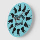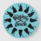 Clock design features an original marker illustration of a silhouetted Neptune statue on the boardwalk in Virginia Beach, VA, on a blue background. Just personalize for a fun beach house, bedroom, or bathroom decoration.