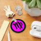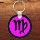 Virgo round button keychain, basic key chain style with magenta (purple hue) background, black border, original virgo symbol design. Round and square premium key chain styles and sizes are also available. Click the "customize" tab to add text, move or resize images if desired. Happy blessings from Happy Wishing Well dot com.