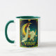 Mug in a woman in flowing white robes, with a flower in her hair, sitting gracefully on a golden crescent moon, surrounded by stars. Ornate Art Nouveau framing with flowers, and the word “VIRGO”, complete the celestial zodiac illustration.