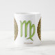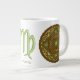 This Virgo themed mandala features a peridot stone surrounded by the symbol for the sign, the constellation, and the alchemical symbol for Earth among filigree and weaves. This mug is available in jumbo, espresso, and bone china sizes and styles.