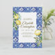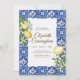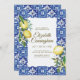 Composed of cursive script and serif typography on leafy greenery green foliage botanicals; All against a backdrop of white, yellow and blue mediterranean Spanish tiles with watercolor yellow lemons. This is a vintage celebration of life, funeral or memorial invitation.