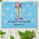 Funny cartoon of a woman wearing a Santa hat and drinking alcohol. Message reads 'At Christmas name could put up with virtual hugs ... as long as she had real prosecco'. The towel is pale blue with a design of snowflakes. Easily personalize this design by editing the template text. Check out all my cartoons in my shop Le Grand Art!