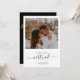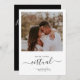 Rustic minimalistic design features modern script , botanical floral leaf with photo, and black color on back of card. Easily personalize your information of choice. Ideal simple wedding invitation for a virtual online wedding.