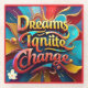 A vibrant design featuring the text "Dreams Ignite Change" in a dazzling array of colors, accented with golden touches that shimmer like stars. The bold typography is surrounded by abstract shapes and swirling patterns, symbolizing the energy and potential of creativity. This piece inspires viewers to embrace their aspirations and transform them into reality."Original Image was generated by Meta AI. AI generated artwork. Licensed under CC BY-SA 4.0.