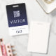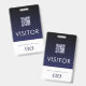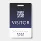 Keep your visitors and guests easily identified with this customizable company logo visitor badge. The navy blue and white design features a customizable logo and text that reads "Visitor" in a simple font. A QR code makes it easy for guests to access important information about your facility or event. The text at the bottom reminds visitors to please return the badge before leaving. This badge is perfect for businesses, hospitals, schools, museums, attractions, and more.