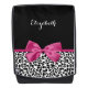 A trendy black and white leopard print boldface backpack with a vivacious dark pink ribbon tied into a cute girly bow. Personalize this chic and stylish animal pattern design by adding the name of your teen girl. Flat printed image, not actual ribbon.