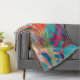 A quality printed throw has its advantages. This is a much finer weave throw than its loopier cousins, and though lighter, it is worth the investment for custom room accessorizing. The back is much prettier than the typical brown, and the fringe on the long sides very vivid, the selvage nicely done. Before photographing, I washed the throw in cold water, delicate, with a thicker woven throw the same size. On tumble dry low, this throw was dry in half the time as the other. This is a very practical quality if you use throws for furniture covers or to wrap up in frequently. The sleekness of the fabric makes it a great layer for accenting or protecting without the feeling of sitting on too much stuff. Perfect for napping or when you feel a light chill coming on. The color printing is beautiful and on this fabric, matched the design and color of my Photoshop image. This is an advantage for blending room fabrics and colors. The fringe on the short sides prints the colors from the design image and therefore varies from the side fringe. I streaked a white fractal line through the plaid pattern to give the illusion of weaving. This printed as crisp as an illusory thread, and put some white in the short side fringe, showing another advantage of print vs loomed- for artistic purposes, line lines, detail, and color integrity can be planned and preserved. My loomed throws have color limitations and more of a needlepoint texture. Print throws reproduce an exact image. The throw felt a little stiff straight out of the package, but this went away in the first delicate wash. Of course I searched the wash water for ink or bleeding and there was none.