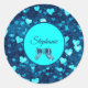 A pretty gift for someone special, this features a two-tone blue circle with a blue bow inside and text that you can personalize against a background of vivid hearts of different shades of blue.