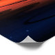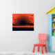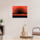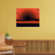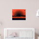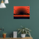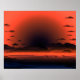 This modern art deco depiction features a vivid blood red sunburst over the beach with birds flying by. Dark clouds gently sweep the sky. An ominous beach scene.