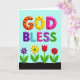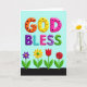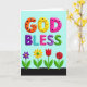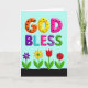 This card features the words “GOD BLESS” centered near the top in big, puffy 3D letters that look like sweet candy, set against a soft sky-blue background. “GOD” is colored orange, yellow, and bright pink, with scattered black polka dots that add a flirty, lighthearted touch ❤️. Just below, “BLESS” continues in a mix of deep purple with black spots, teal with diagonal stripes, pink with small red dots, and two different “S” letters—one striped purple and the other lime green with black dots—creating a friendly, upbeat rhythm. The text is stacked in two lines, with “GOD” above and “BLESS” beneath, both outlined to stand out clearly from the blue. Along the bottom, a dark wavy strip suggests ground, like a garden border where the scene feels cozy and welcoming 🌼. Four stylized flowers stand in a neat row, their simple shapes leaning into a sweet, companionable mood: a purple bloom with a yellow center, a yellow flower with a green center, a red tulip-like flower, and a layered red rose-like flower. Slender green stems and broad green leaves rise from the dark ground, evenly spaced beneath the colorful lettering.