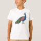 Bold peacock design with saturated blue body and ornate multicolored tail with circular eye patterns; a statement print for apparel and premium gifts.
