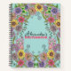 This is a beautifully designed, customizable sketchbook that exudes a sense of elegance and creativity. The cover is adorned with a vibrant and intricate floral design that frames the central personalized text. The blossoms, in hues of purple, pink, yellow, and green, are meticulously detailed, offering an aesthetic appeal that is both refreshing and elegant. The backdrop’s soft teal color accentuates the colorful flowers, creating a harmonious contrast that is pleasing to the eye. The central text is inscribed in a stylish combination of cursive and capital letters, indicating personalization options for any name or title. The sketchbook features a practical spiral binding on the left side, ensuring ease of use.