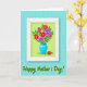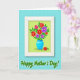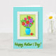 Designed with a framed floral still life at the center, this card features a white beveled border that gently lifts the artwork from the page. Inside the frame, a smooth cerulean-blue vase holds a bouquet of stylized flowers in red, deep purple, and fuchsia, each with a bright yellow center, set against a lime-green background. Green leaves weave between the petals, and a single red flower rests beside the vase like a small, affectionate offering ❤️. The framed image sits on a softly textured aquamarine backdrop that feels like fabric and keeps the scene calm and airy. Beneath the frame, a short Mother’s Day message is placed near the bottom in emerald-green cursive lettering with a faint shadow for depth. The overall layout feels balanced and friendly, with the bright bouquet drawing the eye while the cool outer background adds a gentle pause 🌼. The final detail is the lone red bloom lying to the side of the vase, its stem angled slightly outward on the lime-green field.