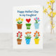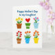 This card features the message “Happy Mother’s Day to my Daughter!” placed near the top in medium blue lettering on a white background. Below the text, six stylized flowerpots are arranged in two neat rows of three, giving the layout a steady, friendly balance. The simple shapes and flat color areas keep the scene light, like a small garden display made to be admired together. One warm brown pot holds sunny yellow, daisy-like flowers, while a green pot with a white zigzag pattern sends up a single red heart, adding a romantic touch ❤️. Other pots show clustered blooms in soft pink, sky blue, deep crimson, and bright orange, like close friends gathered side by side. A light blue pot is dotted with tiny white stars, and nearby a bright blue pot is decorated with large white polka dots 🌼. The pots sit evenly spaced beneath the headline, with the red heart rising above its rim and the star and polka-dot patterns standing out crisply against the white backdrop.