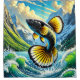 A vivid fish leaps from crashing waves against a dramatic mountain backdrop, its fins glowing in bright yellow and orange hues against deep blue water. The dynamic motion and bold color contrasts create a striking, high-energy scene that blends natural power with artistic intensity.