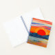 Journal in a semi-abstract ocean sunset behind a mountain range, in psychedelic colors of fiery red and orange, with dark indigo blue mountains