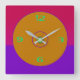 A vivid clock featuring a cerice pink and mauve background gold face and lime green hands. Simplistic and eyecatching clock is of those who dare to be different! Available in round and square shapes