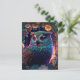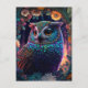 A postcard featuring a beautifully vivid owl in rainbow colors, surrounded by flowers.