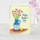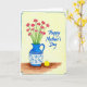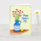 Designed with a soft watercolor look, the card centers on a bouquet of delicate red blossoms with star-shaped petals and slender green stems, arranged like a caring gift ❤️. The flowers sit in a blue-and-white pitcher-style vase decorated with indigo floral patterns and geometric bands, giving the scene a cozy, homey touch. The vase rests on a warm brown tabletop, and the pale yellow background keeps the focus on the arrangement while suggesting gentle morning light. To the right of the vase, a small round yellow character with a simple face appears to glance toward the flowers, adding a friendly, affectionate note 🌼. The phrase “Happy Mother’s Day” is placed in the upper right area in bright blue lettering that matches the vase tones. A thin blue frame surrounds the illustration, and the top-left corner of the border has a stepped detail that stands out. The blue border forms a neat rectangle around the pale yellow field, with the stepped corner clearly visible at the top left.