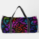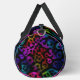 This image showcases a duffel bag with a highly textured and colorful leopard print. The individual spots are filled with a vibrant, almost pixelated or speckled gradient of colors, including various shades of blue, teal, green, yellow, orange, red, and purple. These bright, multi-hued spots stand out dramatically against the solid black background. The bag is equipped with dark, presumably black, carrying straps. This design gives the duffel bag a modern, energetic, and artistic appeal, perfect for making a statement while traveling or heading to the gym.