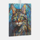 A beautiful long haired tabby cat with yellow eyes that seem to glow is the feature on this pretty stained glass style ornament. The cat is framed in an ornate multi color frame against the predominantly blue mosaic background.