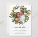 Elegant Citrus botanical save the dates feature a favorite engagement photo encircled by a round wreath of vibrant branches of mandarin citrus and clementine, ivory blossom and leaves, "save the date" in calligraphy script lettering, with your names, wedding date and location beneath in classic gray serif type.