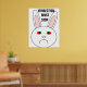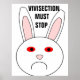 This poster features the sad face of a white rabbit. This rabbit has a big frown on its face because it is a lab rabbit that has had cosmetics tested on it. The whites of its eyes are red and swollen. The design has been created to bring to attention the unnecessary suffering caused by the testing of cosmetics on animals. The bold, black text between the ears of the rabbit says "vivisection must stop". The poster is available in several different sizes, the largest of which is shown here. Put it up at home or at work and support animal rights.