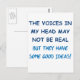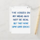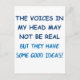 Hearing voices but like what they say? Have fun with your insanity. Reads "The voices in my head may not be real but they have some good ideas!" Available in blue or red and orange print.