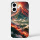 A majestic volcanic eruption dominates the scene, with vibrant red lava flowing down the slopes and a plume of smoke billowing into the sky. The surrounding landscape is lush with greenery, contrasting the fiery eruptio