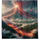 A majestic volcanic eruption dominates the scene, with vibrant red lava flowing down the slopes and a plume of smoke billowing into the sky. The surrounding landscape is lush with greenery, contrasting the fiery eruption.