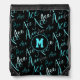 This cool volleyball or tennis themed drawstring bag backpack features the word "Ace" patterned in a variety of font styles and sizes in shades of turquoise blue on a customizable black background - personalize with her monogram, varsity letter or jersey number - by katz_d_zynes