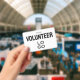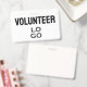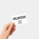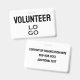 This custom identification badge features a black and white design with the title "Volunteer" printed in a large black font over a white background. A sample company or business logo is placed in the center which you can replace with your own custom logo or other image. The back of the volunteer ID badge contains contact details and additional information.