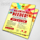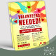 Volunteers needed advertisement flyer template features colorful hands with red hearts, yellow background and bold typography. Customize template to your liking.