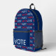 The word vote appears in both red and white on this dark blue backpack. Vote is in a pattern on the front of the backpack. Vote appears by itself on the pocket. The text can be edited if desired.