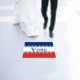 This red, white, and blue floor decal has the word 'Vote' in the center. Th text is dark blue. The top stripe is blue and has white stars. The center stripe is white. The bottom stripe is red with white stars.