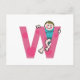 Illustration of a cute little cartoon boy climbing over a giant letter W. Image available on various gifts and products. Postcards.