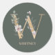 Letter W monogram floral. Letter W in golden brown texture accented with green watercolor compound leaves, flower blossoms and gold dust. Personalized with name in matching font.