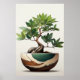 Wabi-Sabi art of a potted bonsai tree with vibrant green leaves and a twisted trunk is depicted with a high level of detail. The pot features a swirling, multi-colored design that complements the organic shape of the tree.