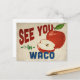 A charming Waco Texas vintage travel postcard featuring a lovely red apple, along with fun retro style text that says, "See you in Waco"