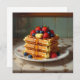 Cute food themed greeting card. An illustration of waffles with strawberries, blueberries, syrup and butter on a pretty antique plate.