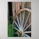 An old wagon wheel sits next to a weathered barn with a touch of green grass for color.